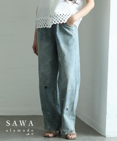 花を添えたインド手刺繍デニムワイドパンツ【4月26日20時販売新作】