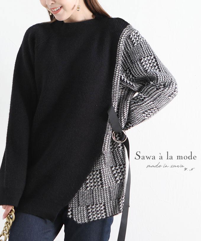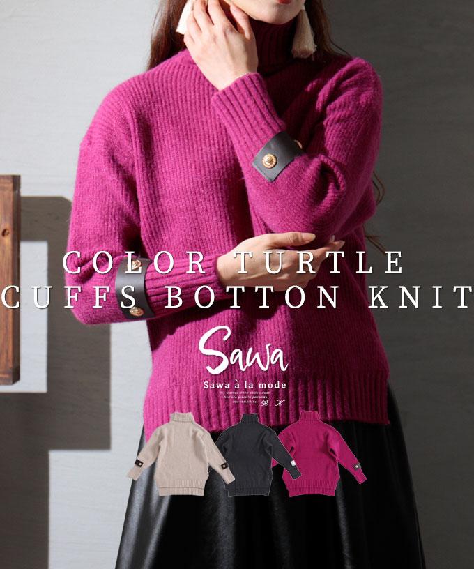 • 刺繍レース袖のリブタートルニット
