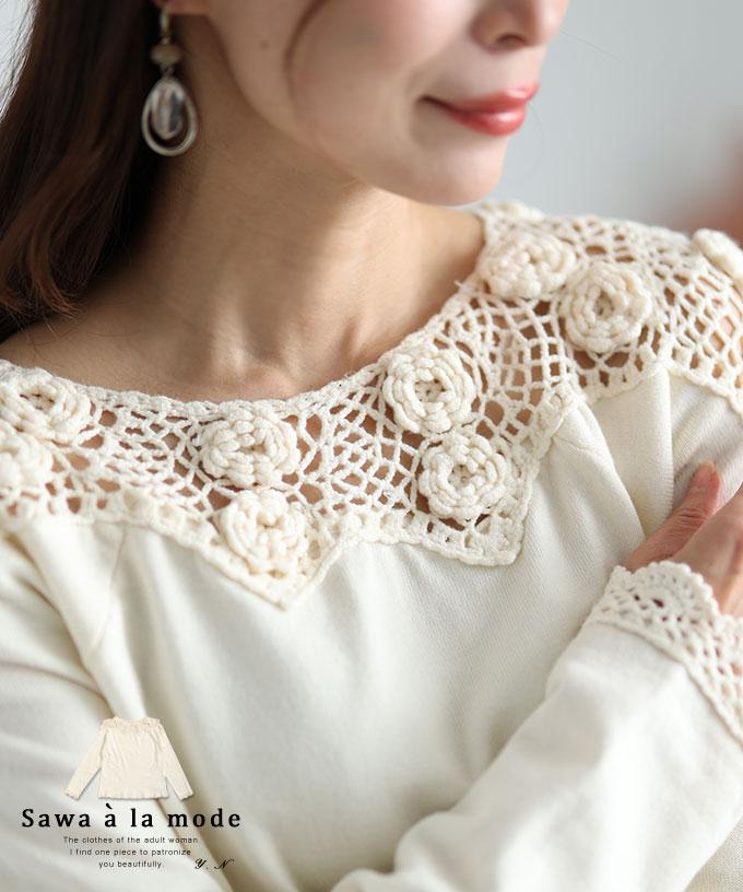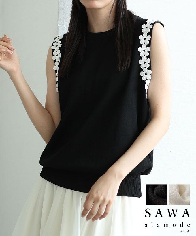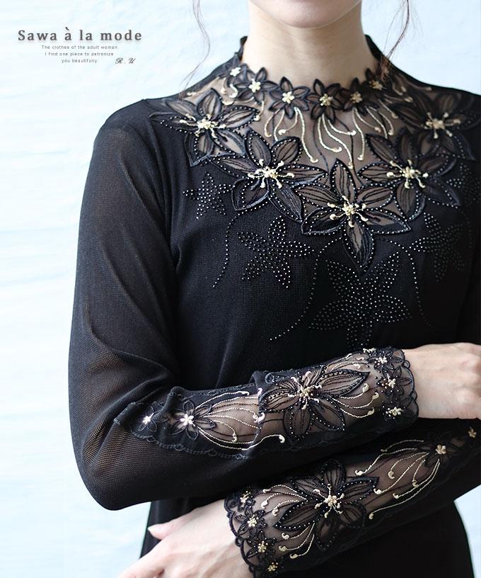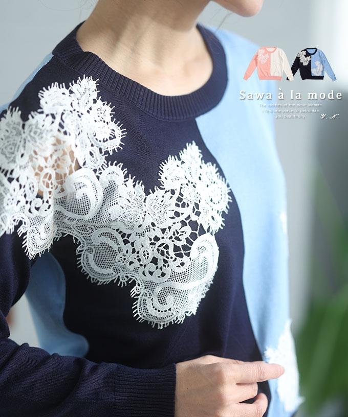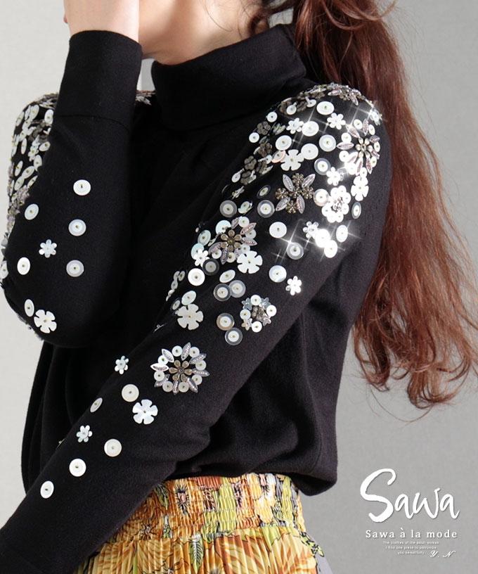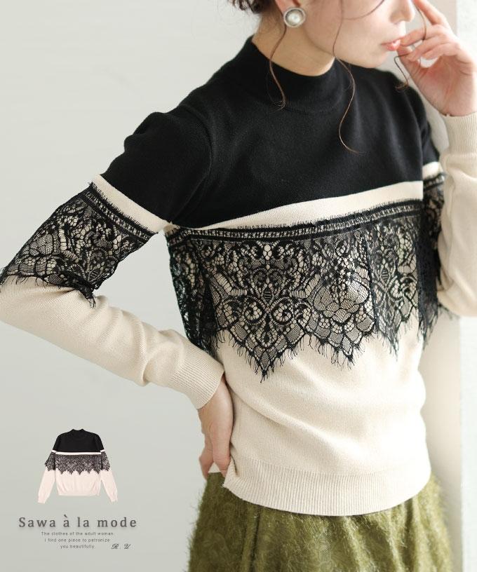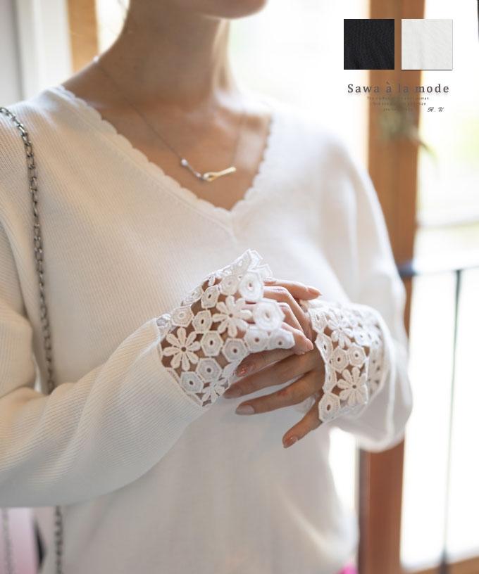 刺繍レース袖のリブタートルニット