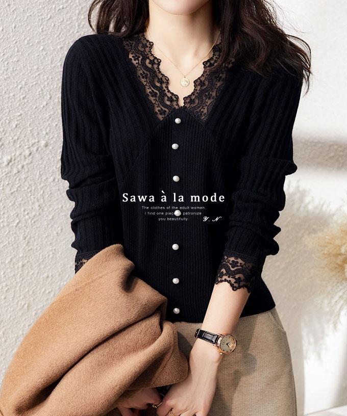 • 艶めくパールのレースリブニットトップス