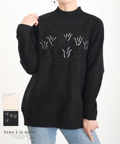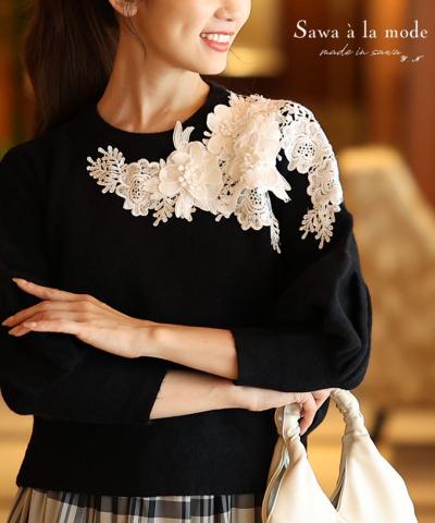 刺繍レース袖のリブタートルニット
