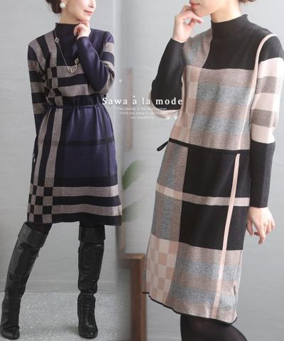 千鳥格子柄ハイネックニットワンピース【11月24日20時販売新作】