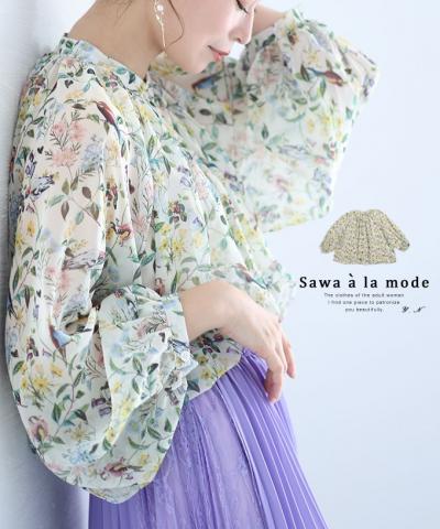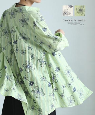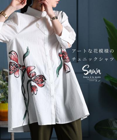 アートなお花のスタンドネックシャツブラウス