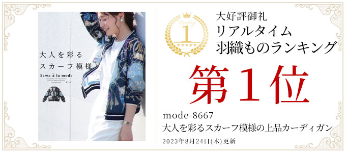 レディース 大人 上品 大人を彩るスカーフ模様の上品カーディガン mode-8667商品番号 mode-8667 5,500円(消費税込:6,050円) 55ポイント進呈 13時までのご注文で即日発送(土日祝、休業日除く) 10,000円(税抜)以上で送料無料!この商品の平均評価: